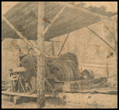| You Wong's eldest son stands at the giant hoist of their dragline placer mine at Finley Bend in 1937. |